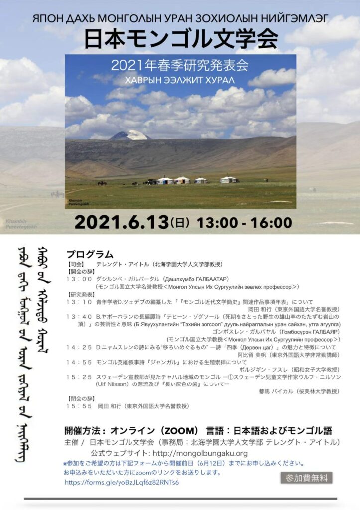 主催:日本モンゴル文学会(事務局:北海学園大学人文学部・テレングト・アイトル)