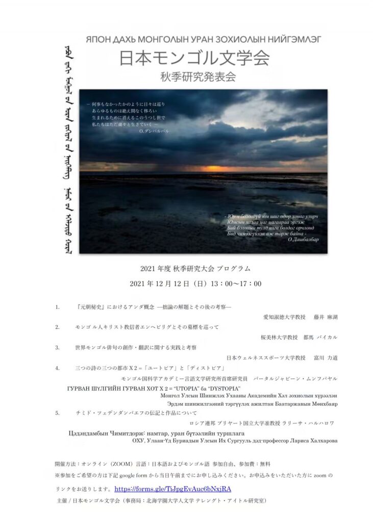 主催:日本モンゴル文学会(事務局:北海学園大学人文学部・テレングト・アイトル)